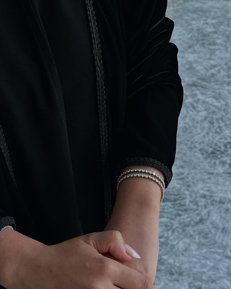 التفاصيل : عباية مطرزة بكلفة قيطان من الامام والخلف والاكمام ، بكسرة في الخلف مع طرحة مطرزة بنفس الكلفة بالعرض