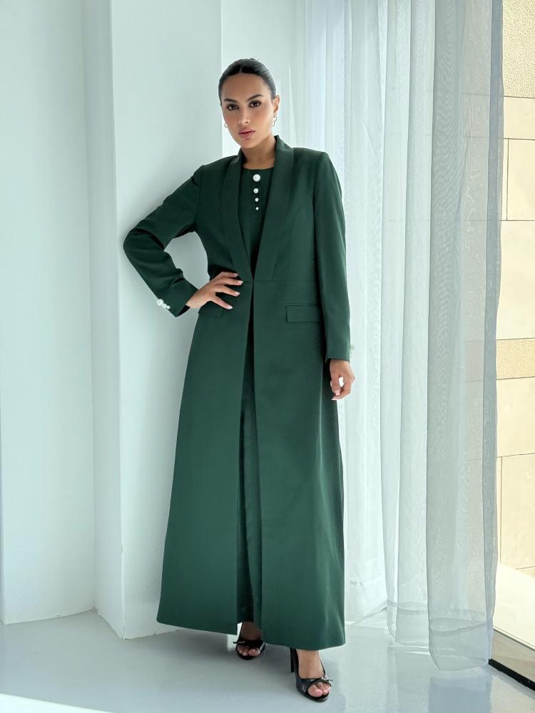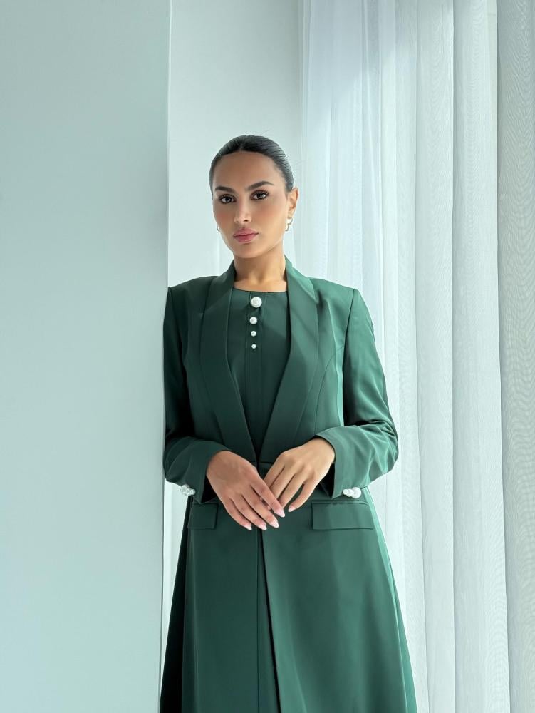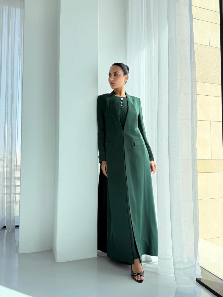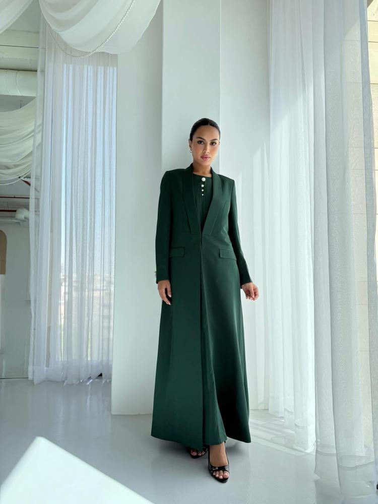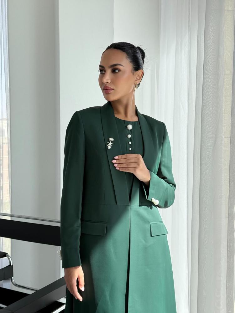احتفلي باليوم الوطني السعودي بإطلالة استثنائية مع عباية البليزر الخضراء المصممة بروح الهوية السعودية.