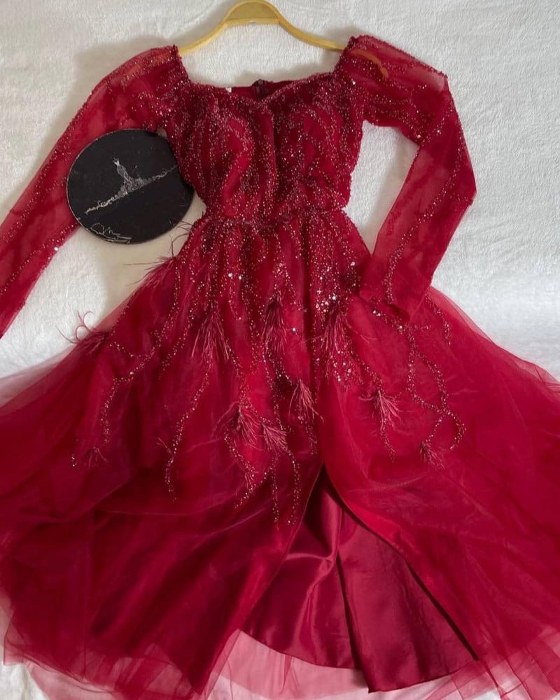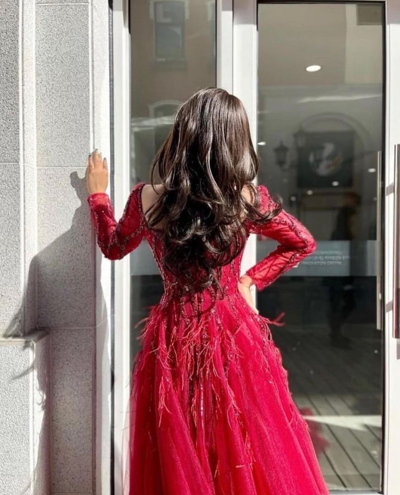 فستان بفخامة الملكات مطرز بالفصوص و مزين بالريش بقصة اكمام طويلة .